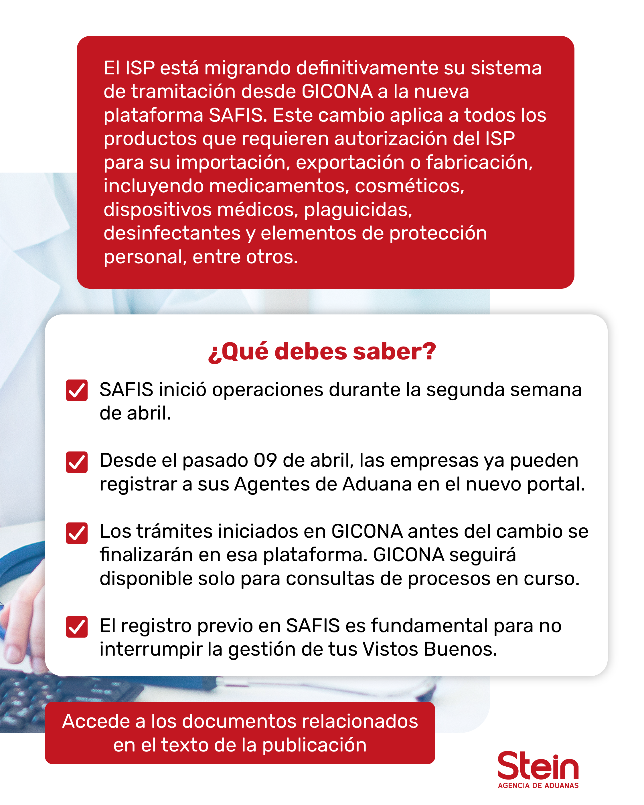 Por medio del presente, le informamos sobre la transición en el sistema de tramitación del Instituto de Salud Pública (ISP), el cual está migrando de la plataforma GICONA a la nueva plataforma SAFIS.
